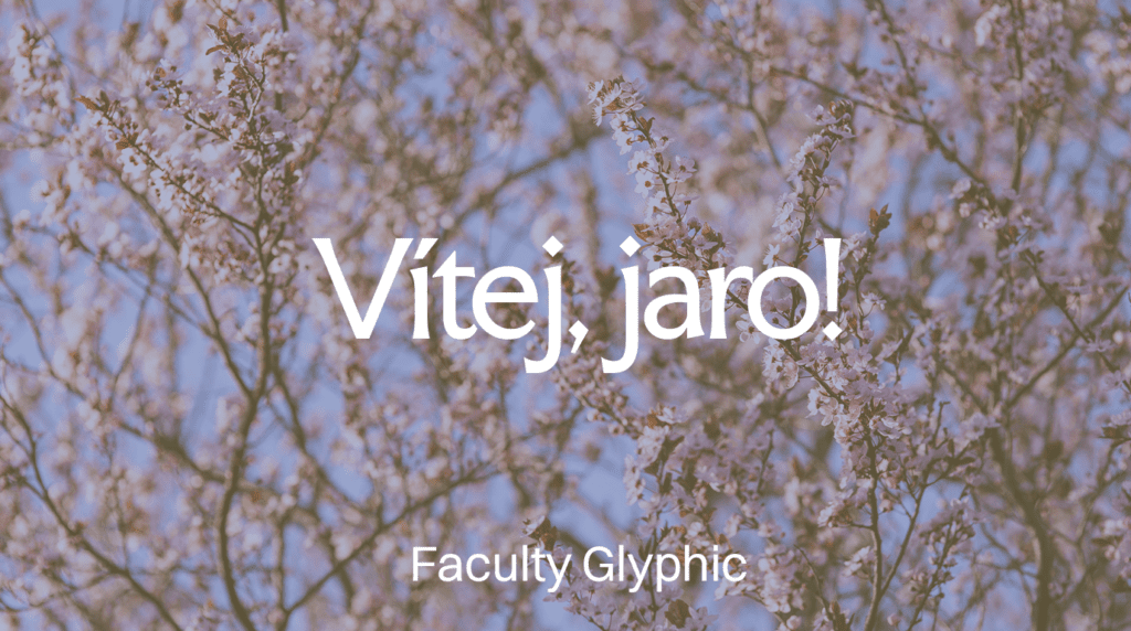 Méně očekávaná volba – lehce technická a strukturovaná. Bezpatkové písmo se hodí do moderních projektů, kde jaro inspiruje spíše tvary – například okvětní lístky a listy – než barvami a lehkostí.